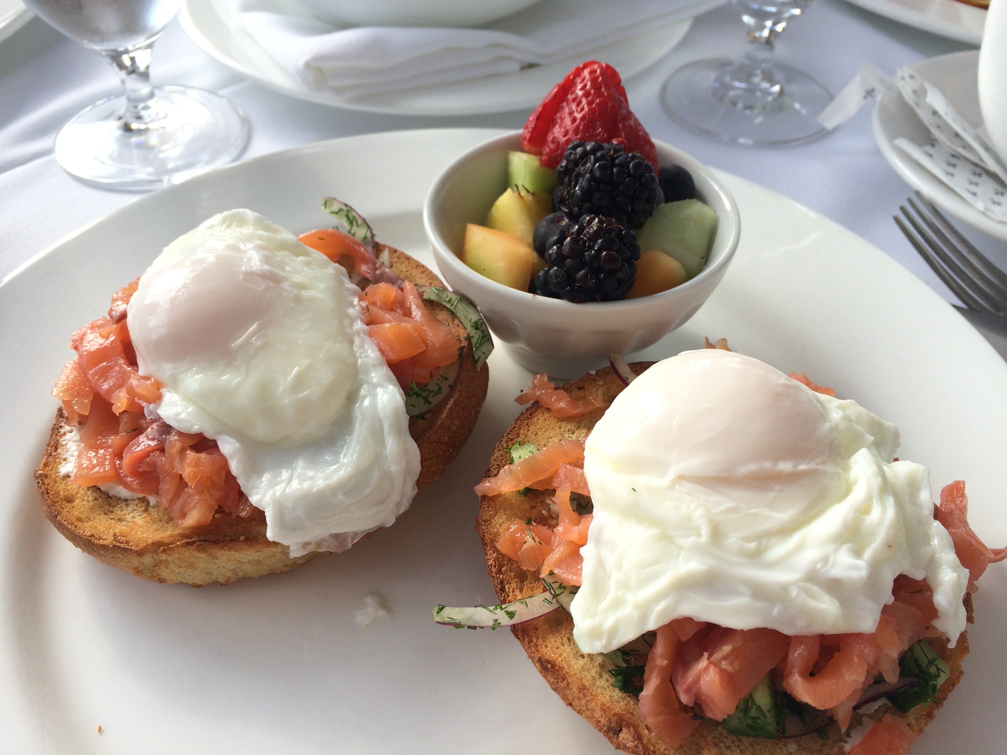 Everyone’s eggs at the table were cooked just the way we asked – runny and soft. Although eggs can seem like a no-brainer, it’s not always easy to make everyone at the table happy. Besides the eggs, the pastry basket at the beginning offered a fun selection of pre-meal bites, and the side of fruit was fresh and plentiful! All in all this meal was a hit for everyone at the table. I can’t wait to see what this place can do for dinner..