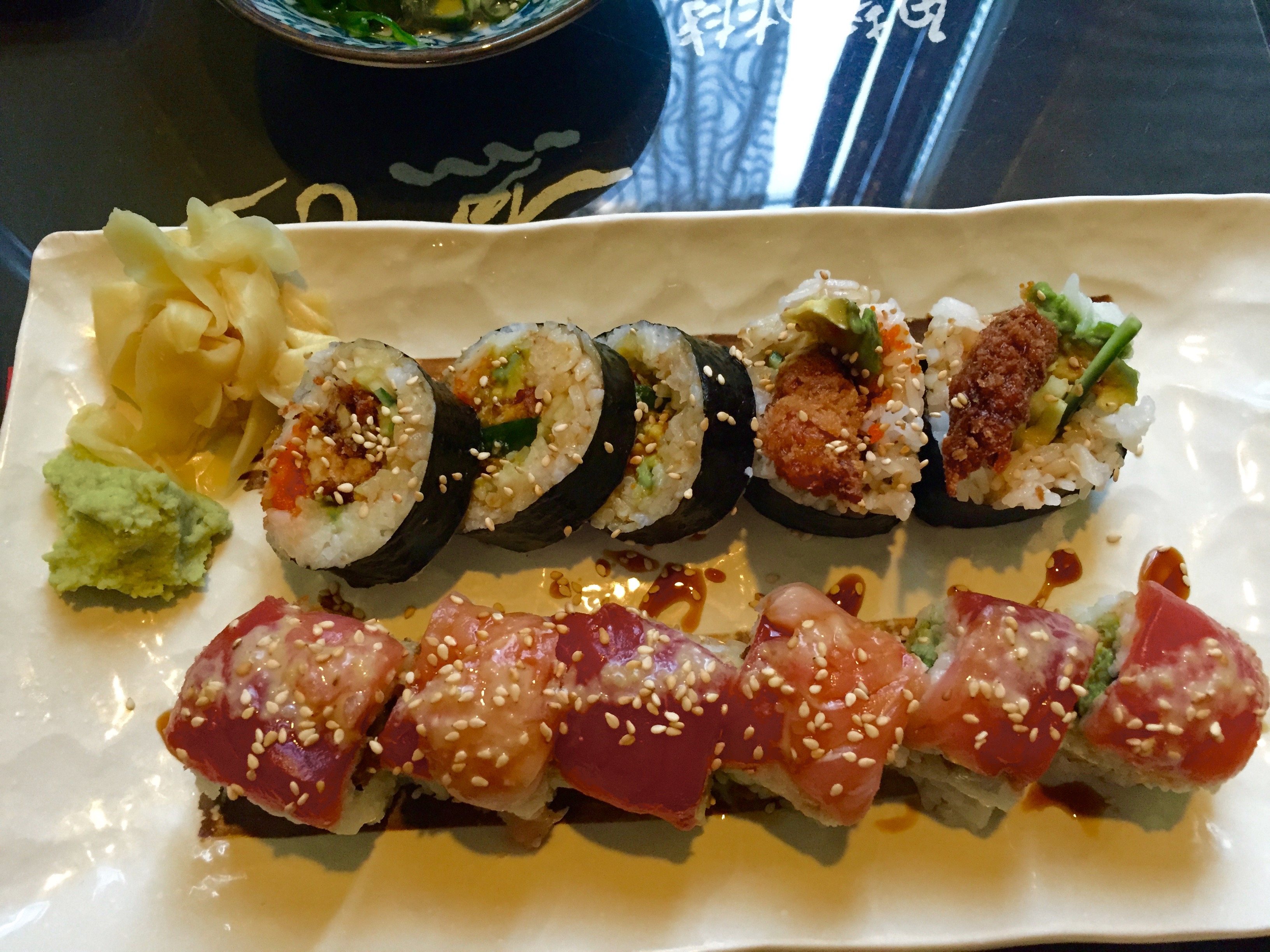 The roll was delicious, and when it came out the softshell crab was still a bit warm. The roll consisted of softshell crab, topped with Tuna, and Hamachi with a ponzu sauce drizzled on top. This roll isn’t listed on the menu but rather on the propped-up side menu that stays on the table (for some reason every sushi restaurant has one of these menus). The rolls on this menu were all quite extensive which made choosing one a very difficult decision! I was happy with the taste and quality of my roll – it was only 6 pieces but considering how much there was stuffed into it, it was quite filling.