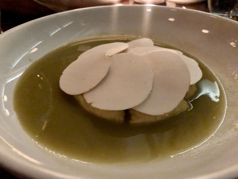 The ricotta dumplings – such a fan favorite that they cover both brunch and dinner menus – could possibly be my best bite this year. Soft and pillowy the dumpling is complemented with a thin, crisp slice of King mushroom. The shroomy umami (sounds like a band name!) sauce is delectable. I dream about this bite. If there must be one dish only on your table, make sure it is this one.
