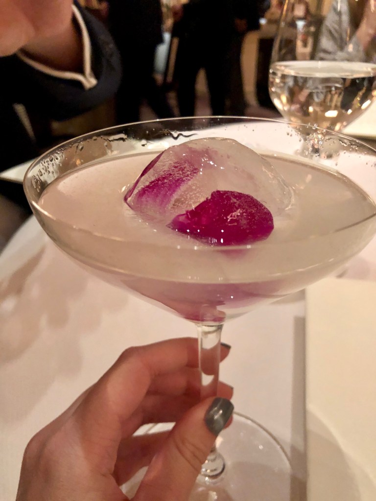 The cocktail list was our first foray into the meal and it did not disappoint. Each cocktail – our table ordered 5 – was tasty, blended, boozy and artistic. Their steep price tag of over $25 per drink however no doubt reflected this. The signature white cosmo earned most of its points on presentation alone as it featured a vibrantly bright purple orchid suspended in a spherical glass ice cube.